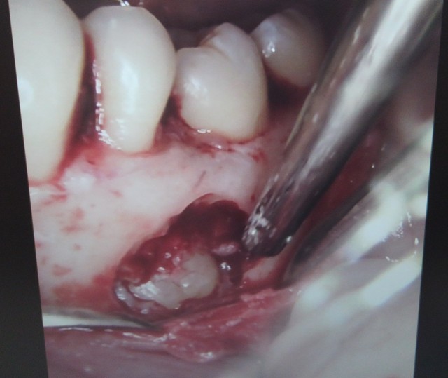 オトガイ孔と神経を見えるように慎重に歯茎を開けてゆきます。